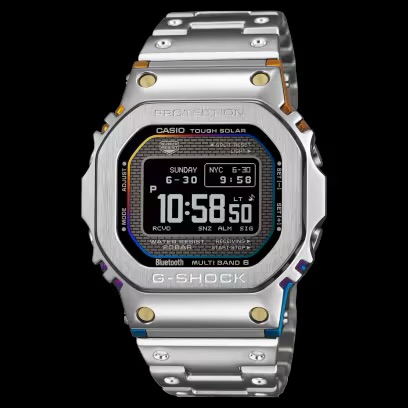 40年以上にわたるG-SHOCKの耐衝撃構造データをもとに、人とAIが共創したジェネレーティブデザインモデルです。 ベゼルとセンターケースを上下で連結した構造を開発。ケースサイドから見える造形が構造の美しさを強調。フルメタルながらG-SHOCKの耐衝撃基準をクリアし、気密性に優れたスクリューバックケースも採用しています。 また、デジタル表示部にMIP液晶を採用。従来液晶に比べきめ細かい描画を可能とし優れた視認性を誇ります。 さらに、4種類の基本時計表示をボタン操作で切り替えられます。 アプリと連携するとメイン表示をクラシカルな7セグメントフォントに切替可能。 機能面ではBluetooth®通信機能により専用アプリと接続し時刻情報を取得。マルチバンド6やタフソーラー等、実用的な機能を備えています。 製造は、初代G-SHOCKを生み出した「山形カシオ」で行われています。