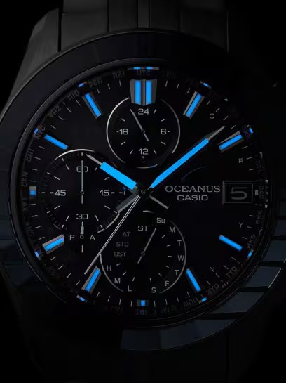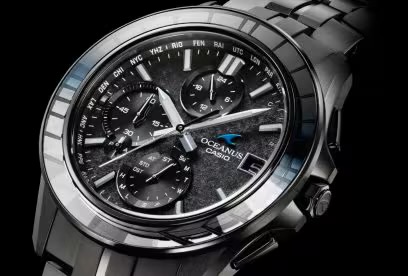 OCW-S7000CNは、その洗練された大人のエレガンススタイルを、「CALM NIGHT」というコンセプトで体現。月の光に照らされた夜の静かな海を、オールブラックのチタン外装と江戸切子のサファイアガラスベゼルで表現した限定モデルです。