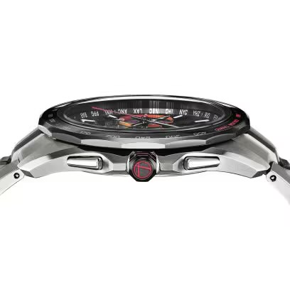 シルバーの文字板は、結晶チタニウムをイメージしたデザインで、光に反射して表情を変えるメタリック塗装をプラス。見返しリングにも同様にメタリック塗装を施すことで、文字板や外装との一体感を演出しました。